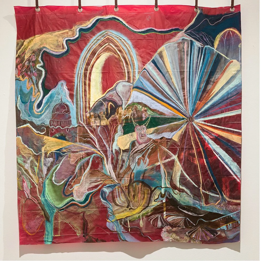 The shared furl of a day’s dreams (El aferramiento compartido de los ensueños), mixed media on shower curtain plastic, 33" x 26.5", 2020-2021