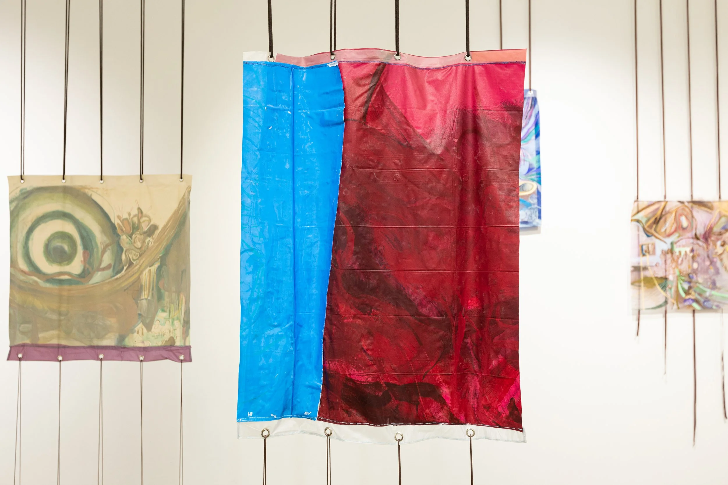 El centro es un punto móvil ( the center is a mobile point), acrylic, oil, soft pastel, and sewing thread on shower curtain plastic hung from turmeric dyed macrame over bamboo dowel, 2022-2023